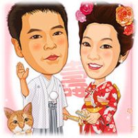 似顔絵題名:ビリヤード-1-1 横 ビリヤード名人のカップルです。お二人の愛用するキュー(ビリヤードの突き棒)が描かれています。また背景にはビリヤード台が描かれています。横長構図です。ブロンズカラーフレームに装丁された状態です。