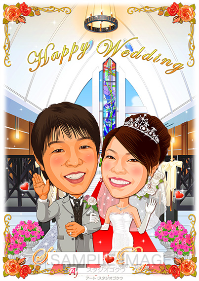 似顔絵題名:教会聖堂ホール-3-1-縦 背景は神戸ポートピアホテル内の教会ホールです。縦長構図です。ホワイトカラーフレームに装丁された状態です。