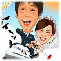 似顔絵題名:スチュワーデス-2-1-横 東京生まれのJALスチュワーデス制服姿の新婦と、大阪生まれのタキシード姿の新郎の新婚カップルです。背景には、通天閣、関西空港、東京タワー、東京湾岸の臨海高層ビルなど、大阪・東京のふるさと自慢テーマにもなります。横長構図です。ホワイトカラーフレームに装丁された状態です。